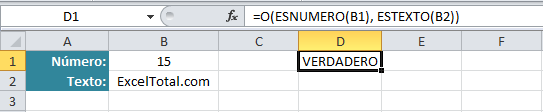 Podemos utilizar funciones como argumentos de la función O siempre y cuando devuelvan VERDADERO o FALSO como resultado. En el siguiente ejemplo utilizo las funciones ESNUMERO y ESTEXTO para evaluar el tipo de dato de las celdas B1 y B2.