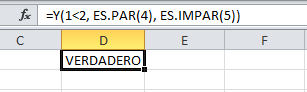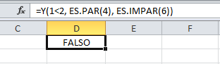 Ya que tanto la expresión lógica como las funciones son evaluadas como verdaderas, entonces la función Y nos un resultado VERDADERO. Ahora observa como al cambiar solamente el argumento de la función ES.IMPAR con el número 6 (en lugar de 5), causará que la función Y nos devuelva el valor FALSO.